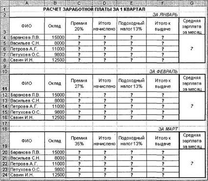 Задание 21.1. Используя таблицу «Расчет заработной платы за месяц» задания 17.4, создайте комплекс таблиц расчета заработной платы за квартал аналогично заданию на рис. 21.1.