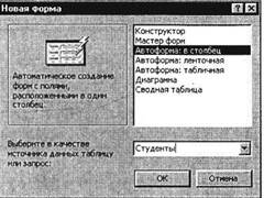 1. Выберите объект базы – Формы. Нажмите кнопку Создать, в открывшемся окне Новая форма выберите вид формы: «Автоформа: в столбец»; в качестве источника данных укажите таблицу «Студенты» (рис. 23.8). Сохраните созданную форму с именем – «Студенты».