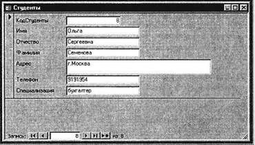 3. Введите две новых записи с использованием формы «Студенты» (рис. 23.9). Для ввода новой записи используйте кнопки работы с записями в нижней части окна (правую кнопку).