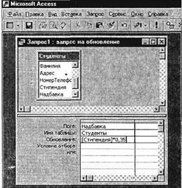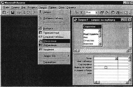 2. В меню Запрос выберите команду Обновление. Обратите внимание на изменения в бланке вида запроса (Сортировка изменилась на Обновление).
