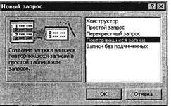 1. Выберите объект базы – Запросы. Нажмите кнопку Создать, в открывшемся окне Новый запрос выберите вид запроса – «Повторяющиеся записи» (рис. 24.5).