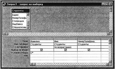 Выберите из списка полей таблицы поля Фамилия, Имя, Телефон. В строке «Условие отбора» поля Фамилия бланка запроса наберите условие – «С*» (символ * свидетельствует о наличии произвольных символов за буквой «С») (рис. 24.7).
