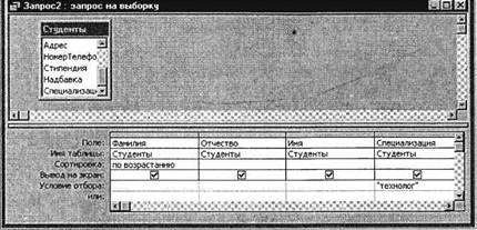 Для этого создайте запрос (Создать/Конструктор). Добавьте таблицу «Студенты». Выберите выводимые поля Фамилия, Имя, Отчество, Специализация. В строке «Условие отбора» поля Специализация бланка запроса наберите условие – «технолог». Задайте сортировку по возрастанию по полю Фамилия.