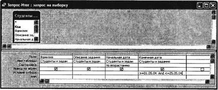 Создайте по таблице «Студенты и задания» запрос на выборку всех студентов, которым надо представить курсовые работы (конечная дата) с 01.05.04 по 25.05.04 (рис. 25.2). Задайте сортировку по Начальной дате по возрастанию. Сохраните запрос под именем «Запрос – Итог».