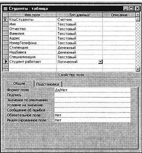 Краткая справка. Для создания поля с логическим типом откройте таблицу «Студенты» в режиме Конструктор (рис. 25.6). После этого введите имя поля и задайте логический тип поля.
