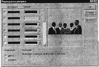 5. Перекрасьте рисунок. Для этого щелчком по рисунку выделите его (появятся маленькие квадратики по сторонам рисунка) и в панели Настройка изображения нажмите кнопку Изменение цвета рисунка (рис. 27.10). Для каждого цвета, используемого в рисунке, можно выбрать новый цвет. Изменения цвета будут отображены в окне предварительного просмотра. После завершения работы нажмите кнопку ОК.