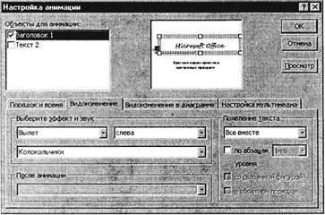 1. Установите курсор на первый слайд. Для настройки анимации выделите заголовок и выполните команду Показ слайдов/ Настройка анимации. Установите параметры настройки анимации в соответствии с рис. 28.1 (выберите эффект – вылет слева). Для вызова окна Настройка анимации можно воспользоваться контекстным меню, вызываемым правой кнопкой мыши.