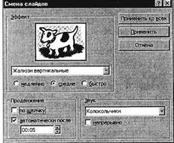 эффект – жалюзи вертикальные (средне); звук – колокольчики; продвижение – автоматически после 5 с. После выбора всех параметров смены слайдов нажмите на кнопку Применить ко всем.