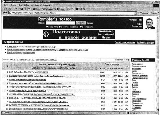 2. Найдите в Тор100 список ресурсов по образованию (рис. 29.4). Ссылка «Образование» откроет страницу с огромным количеством ресурсов, связанных с образовательной и околообразовательной направленностью. В появившемся окне представлена таблица с названиями сайтов, имеющих отношение к образованию. При этом, чем ближе к началу таблицы расположены ресурсы, тем они более популярны (чаще посещаются).