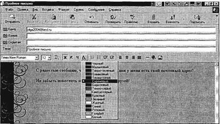 4. После заполнения полей адресации щелкните мышью в нижней части окна письма, чтобы там проявился текстовый курсор – мигающая вертикальная черточка. Наберите текст письма. Используя кнопки панели форматирования текста, измените размер, начертание и цвет шрифта текста письма.