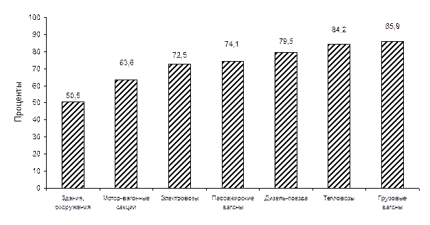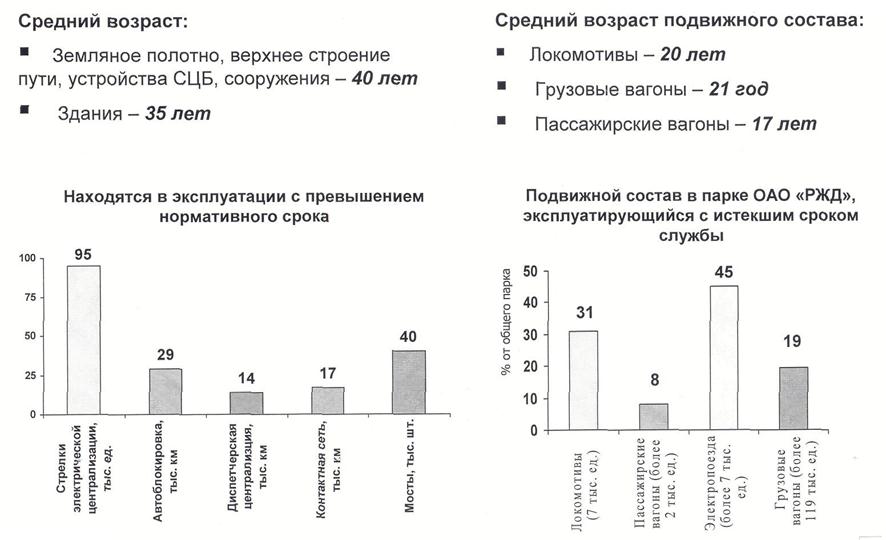 1. Хроническое недофинансирование железнодорожного транспорта привело к недопустимо высокому уровню износа основных фондов, что не способствует расширенному воспроизводству технических средств. Средний уровень износа основных фондов составляет около 60%, значительная их часть находится за пределами нормативных сроков службы.