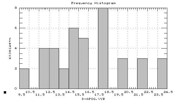 6)Data (ввести данные): с помощью [F7] ввести переменную APOG.VYR и нажать клавишу исполнения [F6]. После просмотра панели исходных данных (на ней можно задать собственные обозначения осей графика) снова нажать [F6]. На экране появится изображение гистограммы, соответствующей рассчитанной ранее группировочной таблице (рис. 2.3).