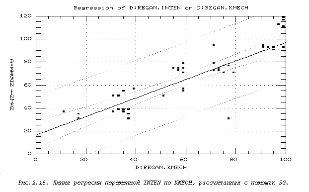 На рис.2.15 жирной линией прочерчена линия регрессии переменной INTEN по KMECH. Хорошо видна точка пересечения (Intercept) этой линии с осью ординат на уровне 16,4. На этом же рисунке представлен график рассеивания выборки в виде точек. Предельные значения отклонений от полученных расчетных значений на согласованном уровне доверия показаны в виде пунктирных линий.