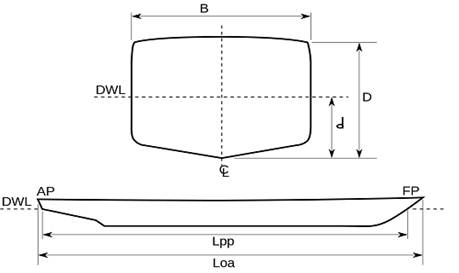 Рис. 3.2. Главные размерения судна.