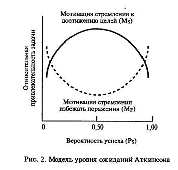 Модель уровня ожиданий Аткинсона, изображенная на рис. 2, показывает, что люди определяют уровень ожиданий, оценивая удовольствия, связанные с успехом, и огорчения, связанные с неудачей. Они стремятся к достижению целей, которые максимизируют общую привлекательность всей задачи. Однако в этой диаграмме нас поражает прежде всего то, что люди с особенно сильным стремлением к успеху рискуют иначе, чем те, кому важнее избежать поражения. Люди, стремящиеся добиться успеха, рискуют в пределах 50:50, а те, кто боится поражения, предпочитают крайние варианты. Ориентированные на успех максимизируют привлекательность задач, устанавливая такой уровень ожиданий, при котором они могут приписать успех своим способностям, А те, у кого велика боязнь поражения, стараются избежать разумной средней степени риска, чтобы не нанести ypoн своей самооценке. Ставя перед собой несложные задачи, они не могут потерпеть поражение, а если задачи настолько сложны, что вероятность успех; очень мала, они утешаются тем, что неудача был; неизбежна. В любом случае выбор целей и задач определяется прежде всего стремлением к сохранению самооценки.