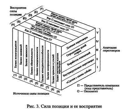 Сила позиции, независимо от ее источника, существует лишь постольку, поскольку ее воспринимает оппонент. Для восприятия силы позиции очень важно следующее: одна сторона должна быть уверена, что она обладает силой, а другая сторона — что эта сила действительно существует и что надо признавать ее полномочия. На рис. 3 изображена модель восприятия силы позиции, включающая три элемента: источники, восприятие и анатомию переговоров.