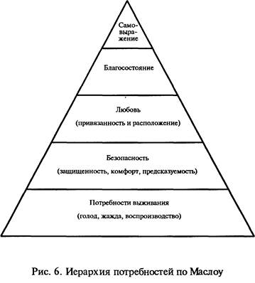 Человеческое поведение мотивируется желанием получить удовлетворение. Абрахам Маслоу утверждал, что люди распределяют свои потребности в иерархическом порядке — от самой существенной до наименее значимой. Так как удовлетворить все потребности сразу невозможно, самые насущные из них удовлетворяются в первую очередь. Можно представить эти основные потребности в виде пятиэтажной пирамиды. Структура, изображенная на рис. 6, включает: 1) средства выживания; 2) безопасность; 3) любовь; 4) благосостояние; 5) самовыражение. Обычно эту иерархию называют «иерархией потребностей по Маслоу».
