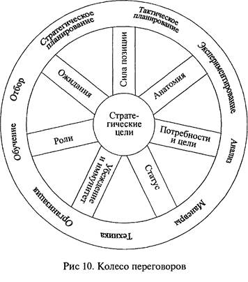 Я намеренно именно так изобразил КОЛЕСО переговоров. Отдельные личности могут идти к цели пешком, но их путешествие будет долгим и рискованным (конечно, некоторым участникам переговоров еще предстоит изобрести свое колесо). Колесо позволяет хорошо представить себе переговорный процесс.