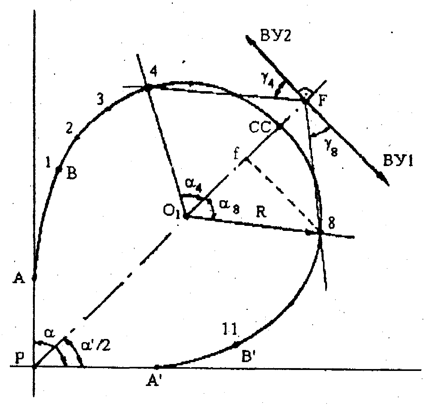 На биссектрисе угла α в точках O1 (центр окружности) и F (ось ППС) устанавливают теодолиты и, откладывая углы α8 и γ 8, получают положение точки 8.
