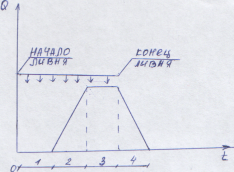 1фаза – сток отсутств. т.к. осадки впитыв. почвой и идут на смачивание растительности; 2 фаза – фаза подъема, Q увеличивается, так как доходят потоки воды с более удаленных частей водосбора.