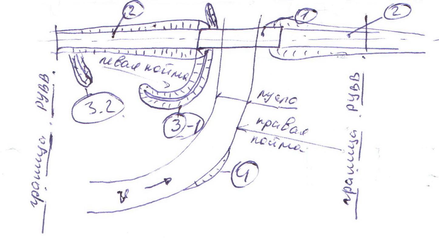 3 – сооружения,направляющие пойменные потоки под мост (струенаправляющие дамбы 3.1 и траверсы 3.2)