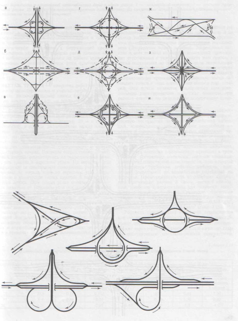 П. и п.дорог в разных уровнях (транспортные развязки) следует принимать, как правило, в следующих случаях: на АД 1а категории с АД всех категорий и на АД 16 и II категорий с АД II—III категорий; при пересечениях дорог III категории между собой и примыканиях при суммарной перспективной интенсивности движения более 8000 прив. ед./сутки.