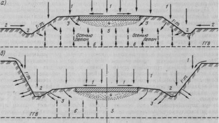 а — в насыпи; б — в выемке; / — атмосферные осадки; 2 — поверхностные воды; 3 — просачивающаяся вода; 4— парообразная вода; 5 — пленочная вода; 6 — капиллярная вода; ГГВ —горизонт грунтовых вод