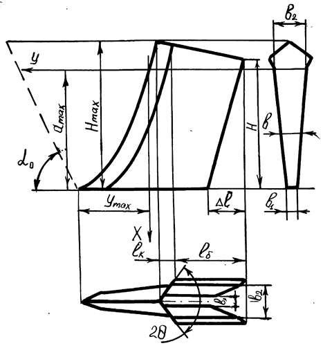 Схема к определению параметров коробчатого сошника приведена на рисунке 11. Сошник при образовании борозды не должен нарушать расположение почвенных слоев. У коробчатого сошника с острым углом вхождения в почву это возможно в том случае, если угол наклона профильной линии его лобового контура к горизонту в любой точке будет меньше угла трения почвы по металлу. Для этого профильная линия должна иметь вид кубической параболы.