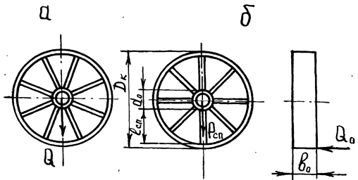 Схема к расчету спиц и обода колеса приведена на рисунке 14. Форму поперечного сечения обода принимаем прямоугольной.