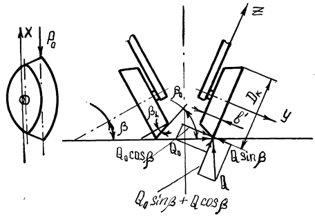 При движении агрегата по кривой или на склонах на колесо действует осевое усилие Q0.