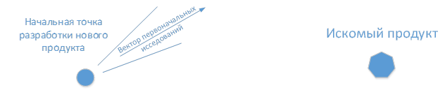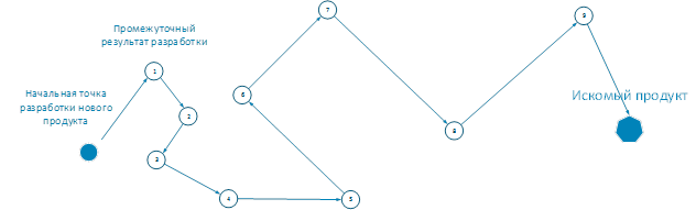 Путь исследователя в условиях неопределенности можно представить в виде ломанной линии, движение по которой происходит от одного промежуточного результата к другому. При этом, чем выше неопределенность первоначальных условий, тем длиннее путь, тем больше отклоняется вектор исследований на каждом из этапов от вектора, ведущего к искомому продукту (рисунок 2).