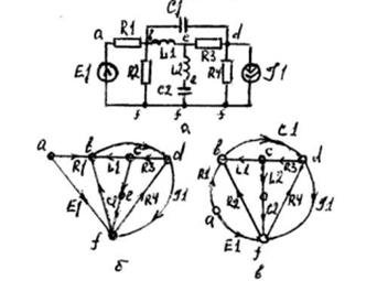 Для построения графа электрической схемы достаточно ее узлы рассматривать как вершины, а каждый двухполюсник заменить ребром, сохраняя отношение инцидентности. Следует иметь в виду, что при изображении электрических схем линии означают проводники без сопротивления, и узлы, соединенные такими линиями, являются по существу одним узлом. Узлы, с которыми связаны только два двухполюсника, на схемах обычно не отмечаются (рис. 5.а, узел а).