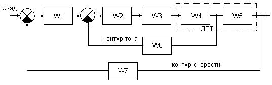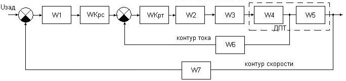 Для определения устойчивости относительно задающего воздействия по критерию Найквиста, разрываем цепь обратной связи по двум контурам (скорости и тока) и определяем передаточную функцию системы в разомкнутом состоянии (рисунок 9).