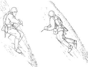 Самостраховка и самозадерживание на травянистых, снежных и ледовых склонах осуществляются при помощи ледоруба или горной палки. При потере равновесия следует задержаться, уперев штырь ледоруба в склон; в случае срыва повернуться лицом к склону и при падении на живот вонзить в склон клюв ледоруба (штырь горной палки), держась одной рукой за головку ледоруба, а другой—за древко, слегка подняв при этом согнутые в коленях ноги (рис. 1).