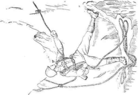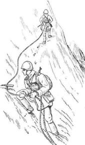 Страховка через ледоруб применяется на снежных и фирновых склонах. Для страховки надо утрамбовать в снегу площадку, вбить в снег или фирн ледоруб так, чтобы головка ледоруба доходила до снега. Веревка должна огибать древко ледоруба таким образом, чтобы ее конец находился в руках страхующего (рис. 7).