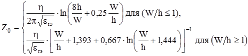 С точки зрения математического расчета наиболее простым типом линии передач является симметричная полосковая линия, показанная на рис. 4а. В такой линии могут распространяться поперечные T-волны, следовательно, отсутствует дисперсия. Кроме того, электромагнитное поле сосредоточено в области диэлектрика, что наряду со свойством пространственной симметрии существенно упрощает анализ. Однако наибольше распространение получил другой тип линий передач - микрополосковые линии (рис. 4б). Для микрополосковых линий характерна малая высота подложки (менее 1 мм) и ее большая диэлектрическая проницаемость (ε>10). Благодаря высокой диэлектрической проницаемости электромагнитное поле в микрополосковой линии концентрируется в области между проводником и заземленным основанием. Благодаря этому уменьшаются потери на излучение, что бывает существенно для СВЧ-диапазона, а кроме того, ослабевают паразитные связи. В силу своей конструкции микрополосковые линии более компактны. Особенно широко микрополосковые линии используются в интегральных схемах СВЧ, а также в других миниатюрных устройствах. Отсутствие пространственной симметрии, более сложная картина поля, которое можно лишь условно описать в виде поперечных T-волн (это так называемая квази-Т волна) приводят к усложнению анализа. Известные численные методы расчета таких линий связаны с большим объемом вычислений, однако существуют упрощенные выражения, приведенные к аналитическому виду. Остановимся подробнее на этих выражениях. Выражение для волнового сопротивления микрополосковой линии имеет вид: