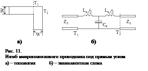 Изгибы микрополосковых проводников чаще всего встречаются при конструировании узла с учетом размещения его на плате. Общий вид и эквивалентная схема такой неоднородности показана на рис.11. Схема состоит из трех элементов – шунтирующей емкости