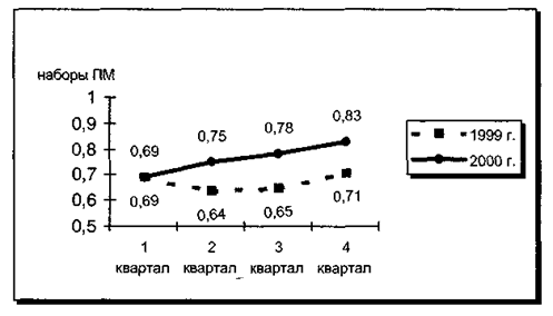 Обратим внимание на расхождение "волн" изменения ПС средней пенсии в 1999 и 2000 гг. Как показывает график 1, в 1999 г. во 2-м, а затем и в 3-м кварталах по сравнению с 1-м кварталом отмечалось снижение уровня ПС средней пенсии. Совершенно иная картина имела место в 2000 г., когда во 2-м и 3-м кварталах по сравнению с 1-м кварталом не только не произошло снижения уровня ПС средней пенсии, а напротив, имел место ее рост. Расхождение рассматриваемых кривых, характеризующих поквартальное изменение ПС средней пенсии в 1999 и в 2000 гг. наглядно отражает процесс позитивных изменений, происходящих в настоящее время в области пенсионного обеспечения.