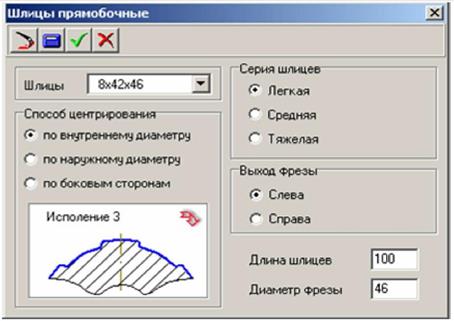 Группа команд способ центрирования позволяет выбрать необходимый способ центрирования шлицев. В зависимости от выбранных способа центрирования и серии будет меняться слайд с изображением шлицев. Если шлицы могут иметь исполнения, в правом верхнем углу слайда появится изображение стрелки. Чтобы выбрать другое исполнение следует щелкнуть мышью в поле слайда.