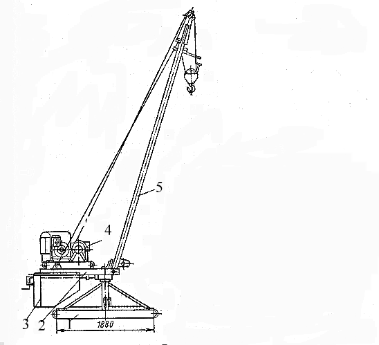 Устроен легкий переносной кран очень просто. Он состоит (рис. 2.7) из основания (1) и поворотной платформы (2), на которой смонтированы противовес (3), лебедка (4) и стрела (5). Масса этого такого крана без противовеса составляет 0,9-1,0 т, а с противовесом – 1,65-2,0 т. Мощность двигателя – 3 кВт. Поворот крана осуществляется вручную. Имеется тормозное устройство и стреловой канат для изменения вылета стрелы.
