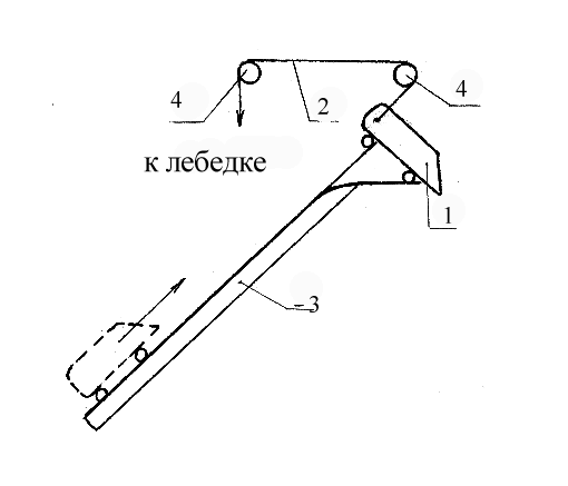 Скиповой подъемник состоит (рис. 2.15) из скипа (1), тягового каната (2), наклонных или вертикальных направляющих (3), направляющих шкивов (4) и лебедки.