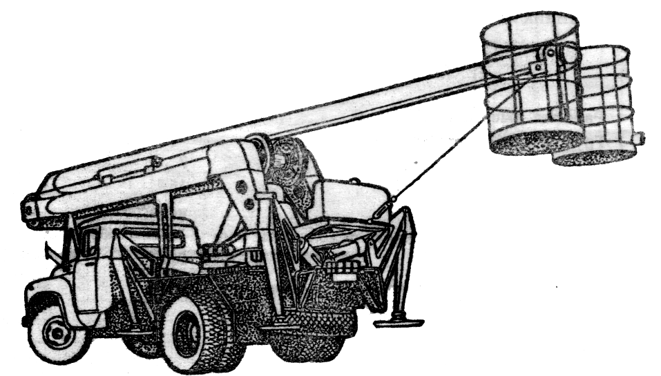 Автогидроподъемники (автовышки)(рис. 2.16) предназначены для подъема людей в люльках с целью выполнения строительно-монтажных и ремонтных работ. Подъемник монтируется на автомобильном шасси, его конструкция позволяет обслуживать объекты, расположенные на высоте до 22 м, а также ниже уровня земли на отметках до 7,0 м и на расстоянии до 15 м от шасси. Грузоподъемность автовышек находится в пределах 300 кг. Управление подъемником осуществляется с пульта, расположенного на поворотной платформе, кроме того, в люльке установлена кнопка аварийной остановки перемещения стрелы. Привод подъемника гидравлический.
