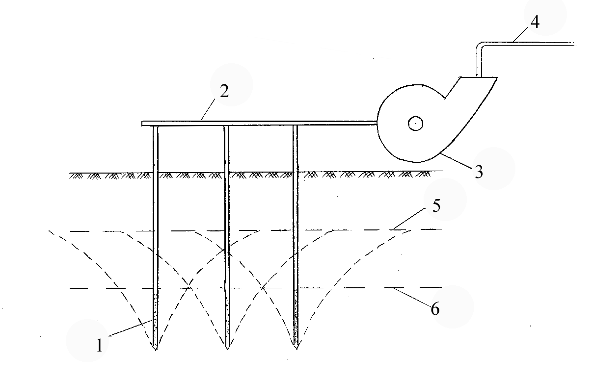1 – иглофильтр, 2 – коллектор, 3 – насос, 4 – водовод, 5 – старый уровень грунтовых вод, 6 – новый уровень грунтовых вод
