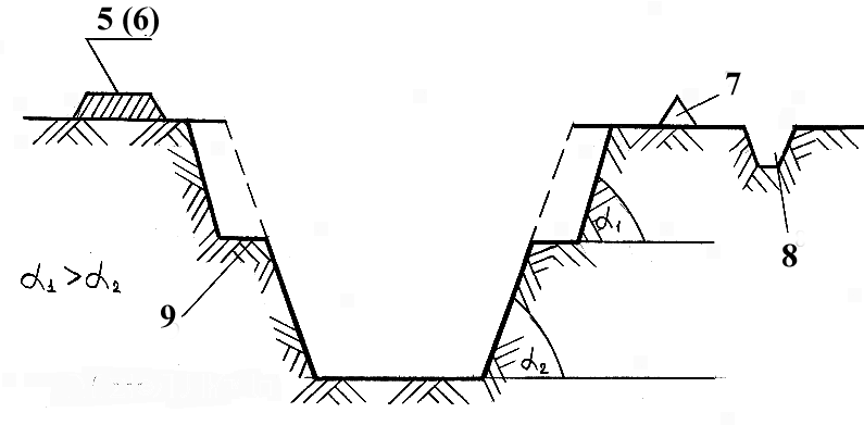 1 – дно выемки; 2 – основание откоса; 3 – откос; 4 – бровка откоса; 5(6) – кавальер;