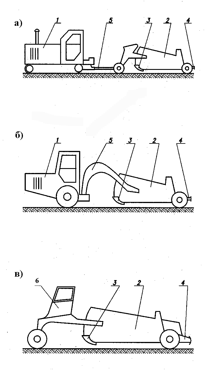 Рис. 4.10. Скреперы: а – прицепной; б – полуприцепной; в – самоходный