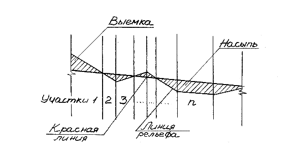 При расчетах объемов работ протяженных земляных сооружений (рис. 4.18) продольный профиль сооружения делят на участки в характерных точках – точки изменения уклона рельефа или проектного профиля (красной линии).