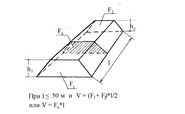 В пределах каждого участка геометрическая форма сооружения представляет собой призматоид (рис. 4.19), объем которого при длине его до 50 м и перепаде высот до 0,5 м может быть с достаточной степенью точности подсчитана по следующей приближенной формуле: