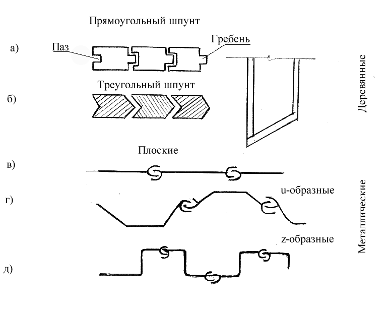 А – деревянные с прямоугольным шпунтом, б – деревянные с треугольным шпунтом, в – металлические плоские, г – металлические U-образные, д – металлические Z-образные