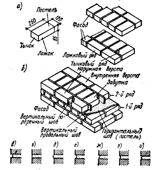 Зазоры между отдельными камнями в кладке образуют швы. В зависимости от расположения в кладке они бывают горизонтальными (постель) и вертикальными. Последние, в свою очередь, разделяются на продольные, если они расположены вдоль стены и поперечные – поперек стены. Швы между отдельными кирпичами должны быть заполнены раствором. Толщина растворного шва – 10 мм (рис. 6.1).