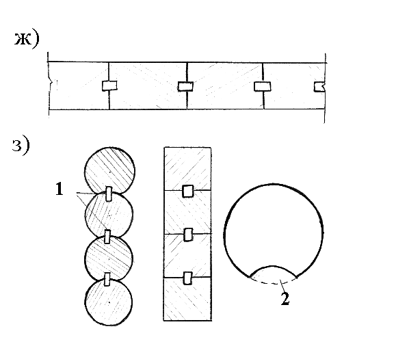 д – в четверть; е – в шпунт; ж – в двухсторонний паз со сквозной рейкой;